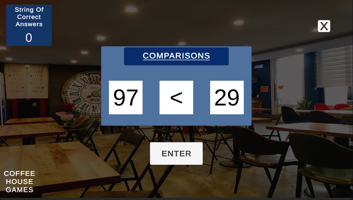Coffee House Games is a series of math-based games that are designed to help the user hone basic math and relational skills.Topics include:- Comparisons (<=>)- Fractions, Ratios and Decimals- Exact change due- Speed word problemsSkills Demonstrated:- Creation of multiple and varied UIs- Custom logic for each mini-game- persistent scoring- design and layout individual games- design and layout the 'wrapper' that houses the mini-games