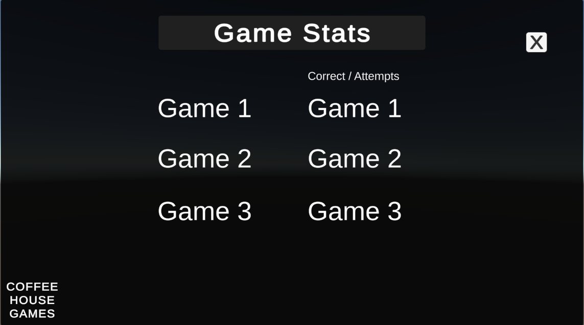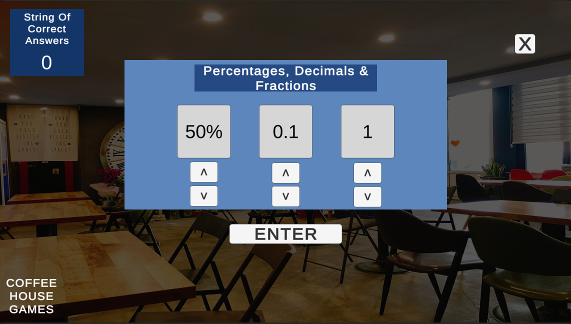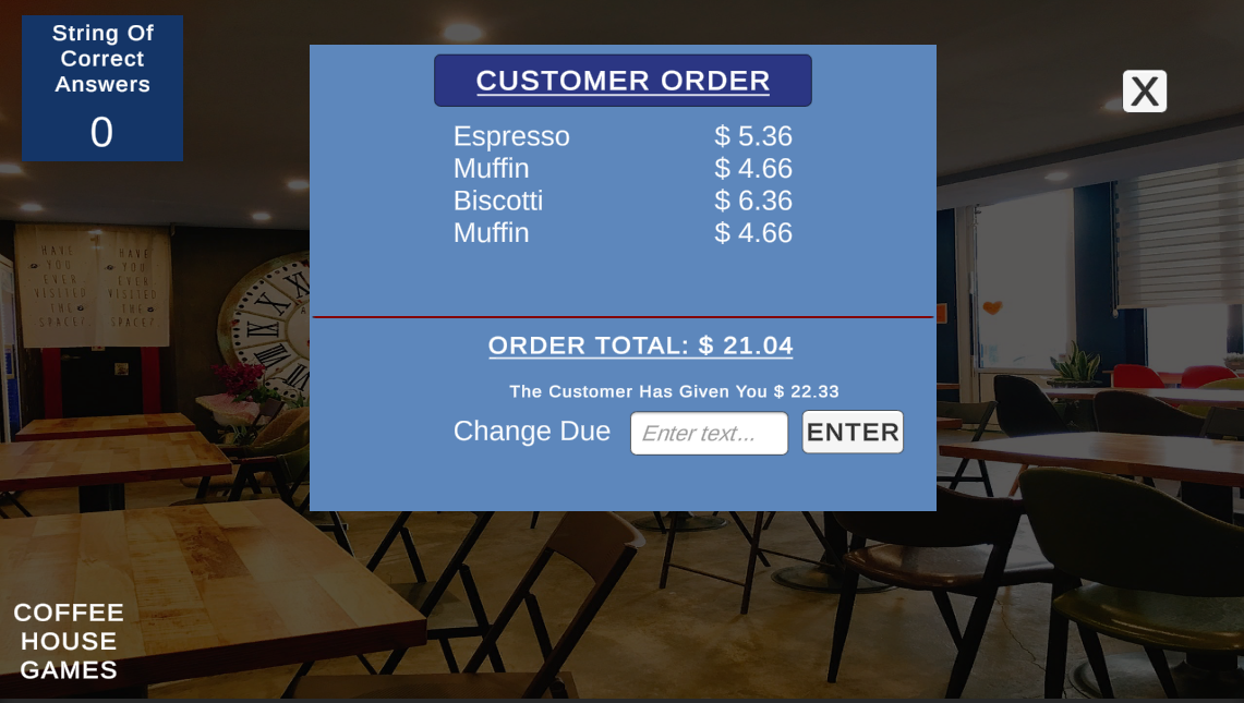 Coffee House Games is a series of math-based games that are designed to help the user hone basic math and relational skills.Topics include:- Comparisons (<=>)- Fractions, Ratios and Decimals- Exact change due- Speed word problemsSkills Demonstrated:- Creation of multiple and varied UIs- Custom logic for each mini-game- persistent scoring- design and layout individual games- design and layout the 'wrapper' that houses the mini-games